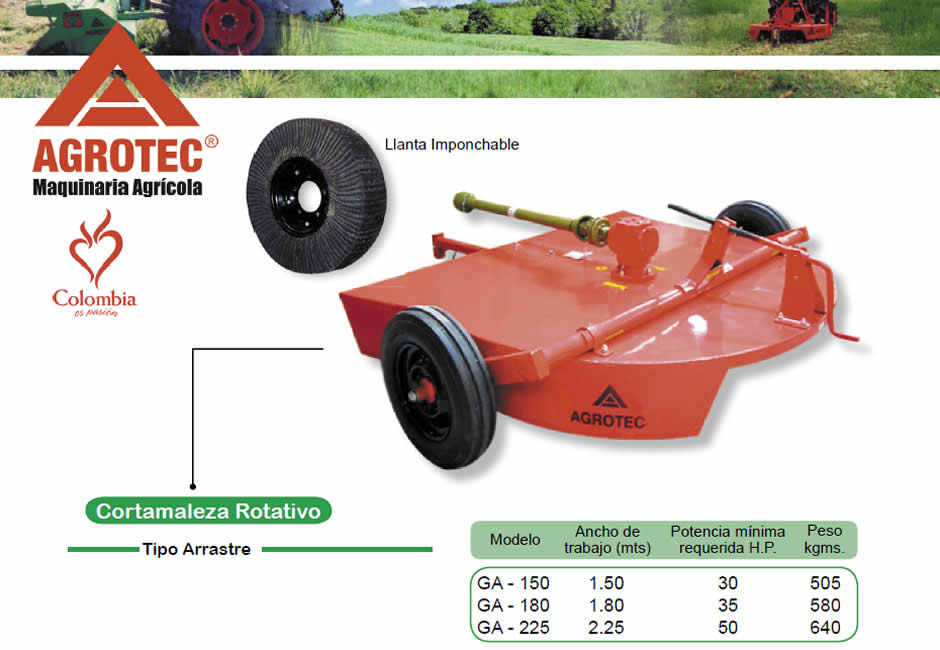 Los Cortamalezas Rotativos de Arrastre (tiro) del tractor son fabricados con estructura en Ángulo y forrados en lámina, especialmente diseñados para trabajos de las más altas exigencias, eje para el transporte, graduación de altura de corte, con ruedas imponchables (sobre pedido) o rines 16” para montar llantas 600 ò 650 x 16, caja de engranajes extra fuerte, cardan importado telescópico trilobular, embrague para protección en las sobre cargas y fundas protectoras, cuchillas importadas en forma de S de doble servicio.