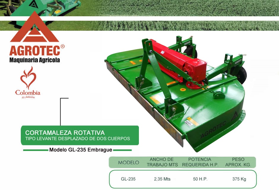 • Ideal para mantenimiento de praderas, destrucción de zocas, malezas, cultivo en hileras como palma africana, cítricos, etc.; en razón de que es desplazado se acerca mucho a los árboles y hace plateo sin que el tractor llegue a maltratar la planta.