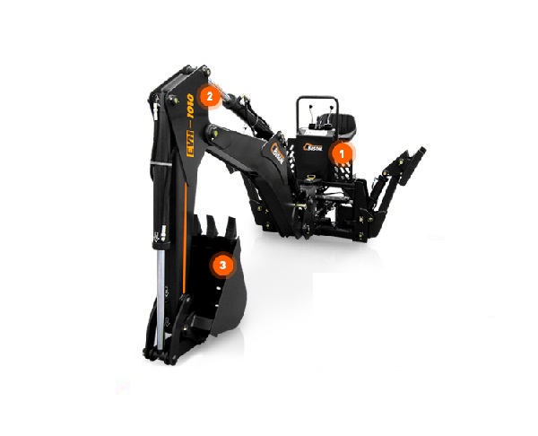 - Para ser montada al tercer punto de tractores de 80 a 100 HP,profundidad de excavación 3mts,arco de giro 180º.